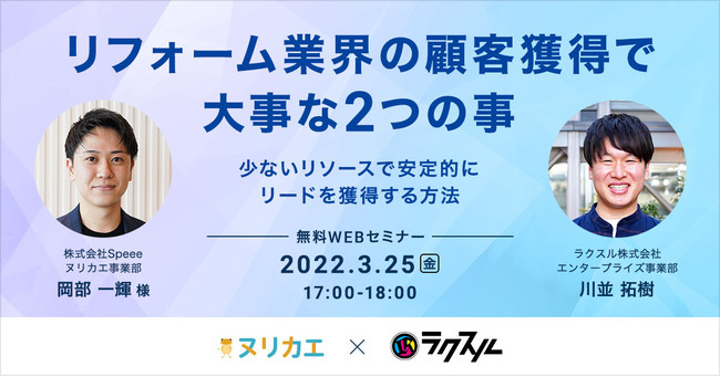 このたび、2022年3月25日(金)に、外壁塗装・リフォームの優良会社紹介サービス「ヌリカエ」を運営するSpeee様と共催セミナーを開催し、顧客獲得競争がレッドオーシャン化しているリフォーム業界で、他社と差をつける顧客獲得手法について両社の観点から事例を踏まえて解説いたします。