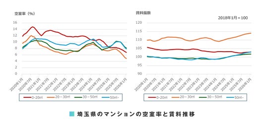 さいたま市ではアパート・マンションのすべての面積帯で空室率の改善が継続しています。アパートの20-30平方メートル 、50平方メートル -、マンションの30-50平方メートル で前月比の支払い賃料が下落したものの、前年同月比の支払い賃料はアパートの50平方メートル -を除いて上昇傾向を維持しています。アパートの50平方メートル -の支払い賃料は2023年半ば以降下落が継続しており、2018年1月の水準を大きく下回っています。交通利便性の悪い地域の物件が家賃を下げて空室を埋めている可能性があります。