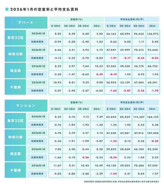 ■2026年1月の空室率と平均支払賃料および前年同月比