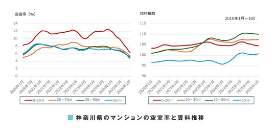 川崎市では、アパート・マンション共に、全面積帯で空室率の改善が継続しています。しかしながら、アパート・マンションの50平方メートル -、マンションの20-30平方メートル を除いて、支払い賃料は前月比で下落しています。前年同月比の支払い賃料は、アパートの50平方メートル -を除いて下落しています。また、アパート・マンション共に家族向けの50平方メートル -の支払い賃料の水準は2018年1月水準を下回っており、交通利便性の悪い地域の物件が家賃を下げて空室を埋めている可能性があります。