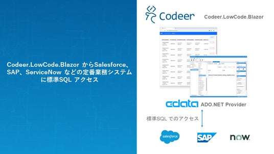 Codeer.LowCode.Blazor は、マイクロソフト社が提供するオープンソースWeb フレームワークBlazor を使用しており、CData が提供する.NET 用のデータドライバーである『CData ADO.NET Providers』の利用が可能です。CData ADO.NET Provider を使うことにより、Codeer.LowCode.Blazor での開発時にSalesforce やSAP などの外部データソースに固有のAPI ではなくSQL ベースのデータアクセスを実現できます。