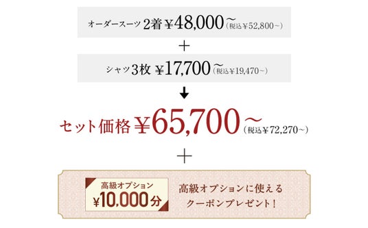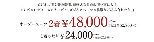 本格オーダースーツ2着48,000円~(税込52,800円~)+高級オプション特典プレゼント