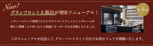 オーダースーツ専門店「グローバルスタイル」を運営するグローバルスタイル株式会社(東京証券取引所 スタンダード市場:7126、本社:大阪市中央区、代表取締役社長 田城弘志)は、グランフロント大阪店のリニューアルを記念して4月1日~5月6日までの期間中、対象プランご利用で高級オプションに使えるクーポン「6,000円分」or「10,000円分」をプレゼントをする「オーダースーツコンビフェア」を全37店舗で開催。