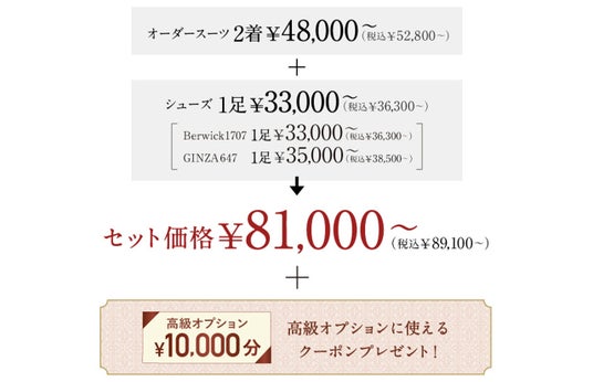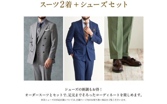 ※…コンビ価格とはオーダースーツ2着以上ご購入していただいた場合の1着あたりのお値段です。組み合わせは自由ですので、異なる価格帯のオーダースーツと組み合わせていただいても本価格が適用されます。