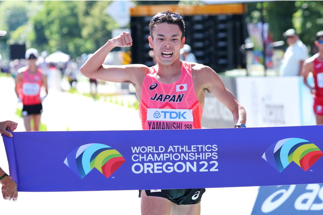 そのなかでも、素晴らしい成果を上げたのが男女20km競歩です。前回チャンピオンの山西利和選手(愛知製鋼)と、東京オリンピックでその山西選手を制して銀メダルを獲得した池田向希選手(旭化成)が終盤でマッチレースを展開する展開となり、山西選手が、1時間19分07秒で2連覇を達成。池田選手が1時間19分14秒で、世界選手権では自身最高順位となる2位で続き、「ワンツー・フィニッシュ」を達成したのです。さらには、今回初出場の住所大翔選手(順天堂大学)も1時間20分39秒で8位に入賞する活躍を見せました。