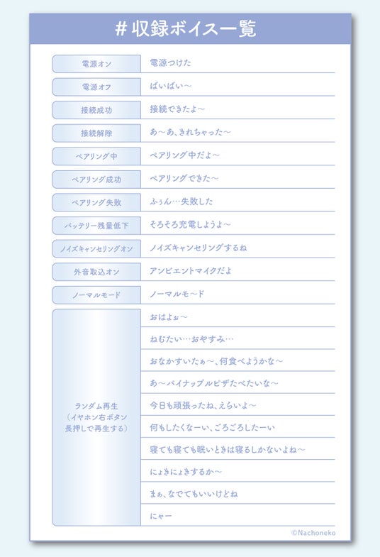 イヤホンの起動/終了や端末との接続状況をお知らせする「ボイスガイダンス」に加え、完全録りおろしの「ランダムボイス」を収録。配信で定番のフレーズだけでなく、イヤホンを通して楽しめる日常的なセリフも本コラボの為に完全新録しました。聴き心地のいいNachonekoボイスをあなたの耳元で、いつでも堪能できる仕様です。