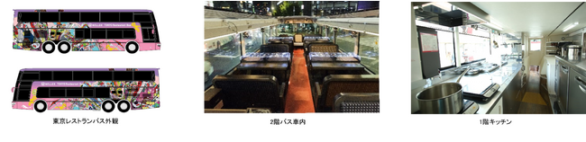 移動と食の融合により新たな感動体験を提供する「レストランバス」は、1階にキッチン、2階には対面式の座席とテーブルを備え、透明で開閉可能なオープンルーフは開放感があり、いつもと違う目線から眺める景色と、本格的な料理をお楽しみいただけます。東京レストランバスの外装は、東京らしさをイメージし、多数のビル群や観光名所を“食”と掛け合わせてポップなカラーリングでデザインしています。内装は、シックな色合いでまとめ、夜は調光可能なLEDと間接照明により、高級感あふれる落ち着いた空間になっています。