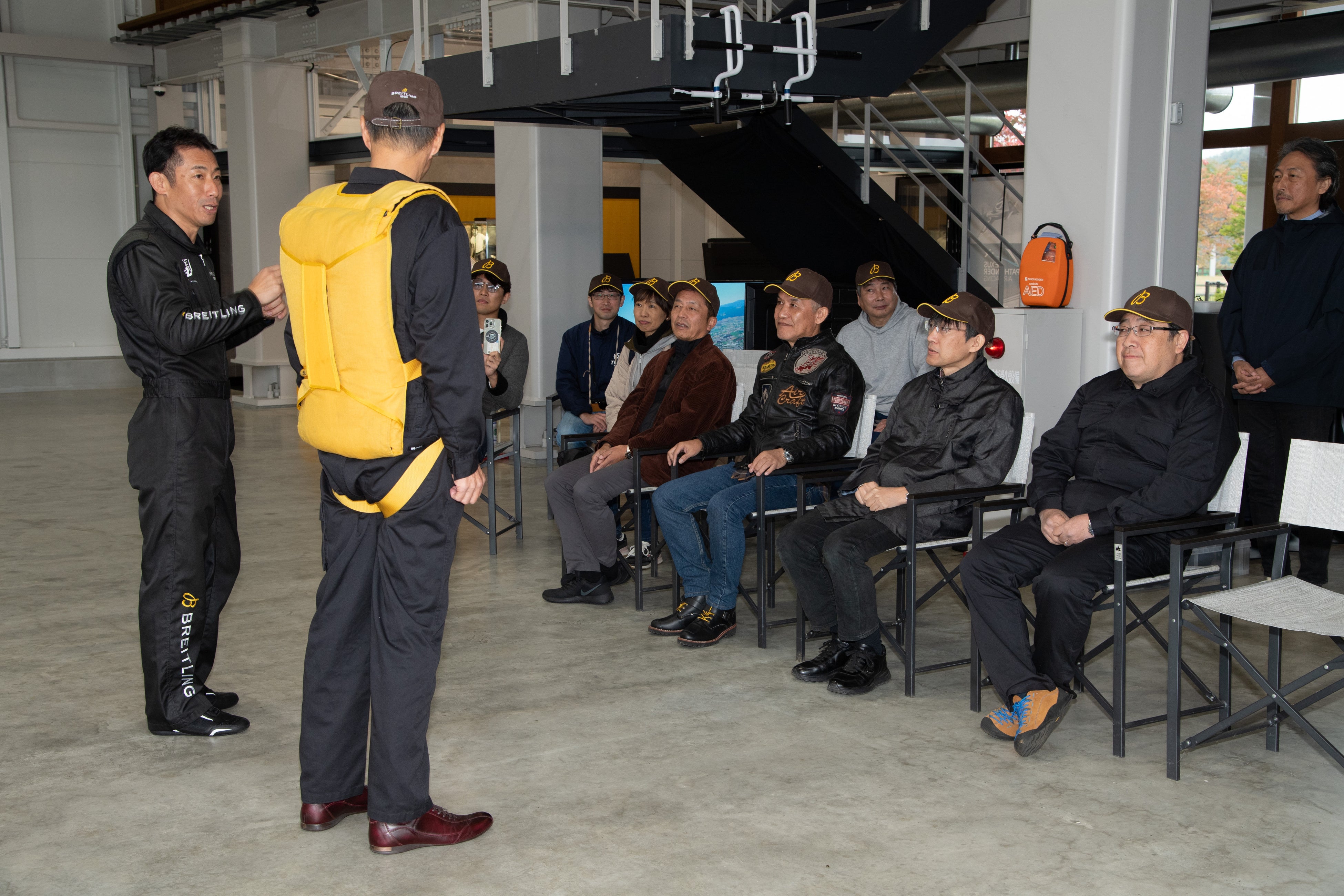 はじめに、室屋選手によるブリーフィングを実施。アクロバット飛行機「EXTRA 330LX」の構造、エアロバティックの基本動作、緊急時の脱出方法、そして空を安全に楽しむためのマインドセットについて、丁寧な説明が行われました。期待と緊張が入り混じる参加者の表情が印象的です。