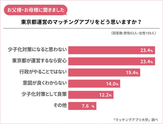 今回アンケートに回答いただいたお父様63人の平均年齢は43.2歳、お母様159人の平均年齢は42.2歳。東京都運営のマッチングアプリに対する印象は、「アプリ運営が少子化への対策になるとは思えない」と「東京都が運営するアプリなら安心」がともに23.4%で1位でした。