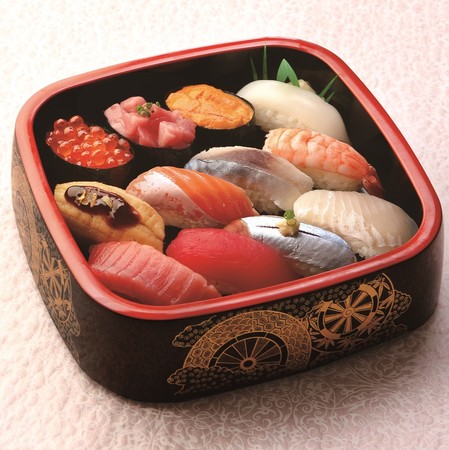 秋の旬ネタ5貫(秋刀魚・平目・金華さば・赤いか・とろサーモン)、 中とろ、まぐろ赤身、生うに、いくら、落ちとろ、柚子ふり穴子、甘海老