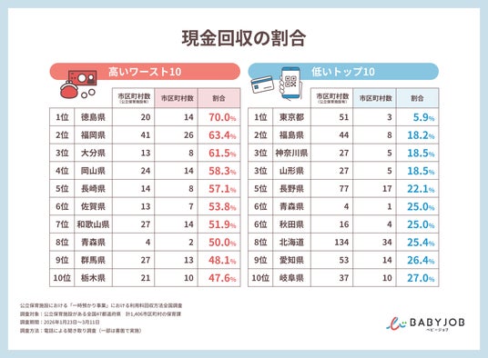子育て支援サービスを展開するBABY JOB株式会社(本社:大阪府大阪市、代表取締役 上野公嗣)は、全国の公立保育施設がある1,406の市区町村の保育課を対象に「一時預かり事業の利用料回収方法」に関する実態調査を実施しました。