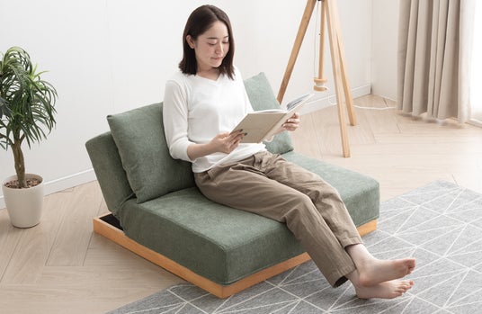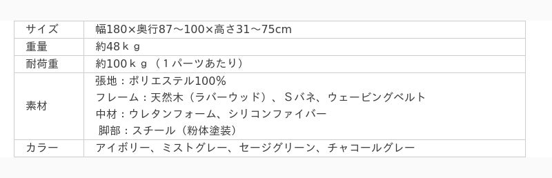 フルフラットにすると幅180cm×奥行100cmの大きさがあるため大人でも快適に使うことができます。また、ソファの向きを変えて背もたれ部分を左右に設置しリクライニングすると頭部分を持ち上げ、足を伸ばしてよりゆっくりと寛ぐこともできます。