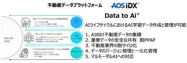 AOS IDXでは、こうしたAIライフサイクルの仕組みに基づき、AIデータにおけるAIシステムのためのAIデータ管理を行い、不動産における優秀なデータがあって初めて優秀なAIシステムを実現できるというData to AI(R)︎のコンプトの元、AOS IDXによって、不動産業務の効率化に向けたプラットフォーム構築を支援します。