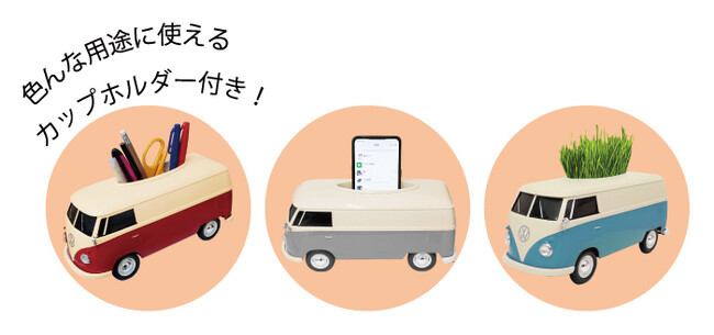 大人気商品のメルセデスベンツG63 AMG型のBluetoothスピーカーやジムニーシエラ型のウェットティッシュケース、フォルクスワーゲンクラシックバス型のティッシュケースなど、ノリモノ型の雑貨を多数展開。