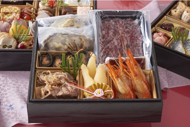 牡蠣グラタン、黒牛ユッケ(タレ付き)、ニシン昆布巻、さけ昆布巻、牛肉の大和煮、数の子、北海しまえび