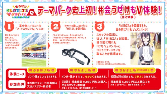 コラボでは、株式会社NTTコノキューデバイス(以下、コノキューデバイス)が開発し、コノキューが販売するXRグラス「MiRZA(R)(ミルザ)」を装着すると、「けもV」メンバーとコミュニケーションが取れる、「XR体験」や、豪華特典がついた新宿-富士急ハイランド間のバスツアープランを3月28日(金)正午より販売予定です。