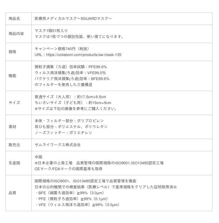 サムライワークス株式会社(代表取締役社長:新島 実 本社所在地:東京都渋谷区)は、第3波拡大防止の対策として、医療現場で使われる高品質で高密度の医療用不織布マスクを一般家庭でもご使用いただけるよう『医療用メディカルマスク~5GUARDマスク~』の緊急追加販売を開始致します。『医療用メディカルマスク~5GUARDマスク~』は、一般的なマスクよりも優れた「PFE・BFE・VFE:99%以上遮断」「花粉・飛沫など99%カット」「ノーズフィッターでウイルスの侵入をガード」「やわらかゴム素材採用で耳への負担をカット」「シルクのようにやわらかい素材で肌への負担をカット」と高性能マスク。また、品質を保証する国際規格(ISO9001)認定がされている日本企業の中国工場で徹底した管理のもと製造された最高峰の高品質と、安全で適正な商品であることを証明するCE・FDAマークも取得。第3波到来と言われる今こそより多くの方々に安心・安全をお届けするため、通常価格1箱(50枚入)1480円のところをキャンペーン価格の1箱(51枚入)740円で販売を行い、さらに2~3営業日でお届けいたします。