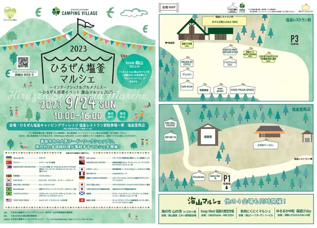 今回は、岡山県真庭市の秋の大イベントである「海山マルシェ」の1会場としてのイベント開催となります。ひるぜん塩釜キャンピングヴィレッジでは「ひるぜん塩釜マルシェ ~インターナショナルグルメフェス~ ~海山マルシェ2023~」を開催いたします。塩釜会場は真庭市内の人気フード・ワークショップに、県内外の多国籍料理が集結するマルシェとなります。