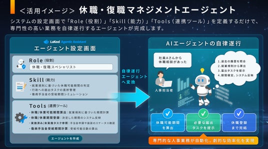 まず、就業規則や人事システムを連携し、休職・復職のワークフローを理解した自社オリジナルの「休職・復職エージェント」を作成します。