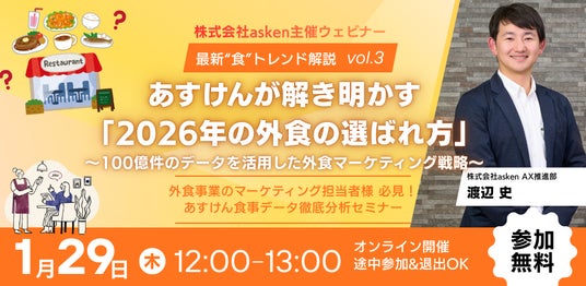 累計会員数1,300万人超・国内No.1*¹のAI食事管理アプリ『あすけん』を開発・運営する株式会社asken(東京都新宿区、代表取締役社長 中島洋、以下「当社」)は、『あすけん』が保有する累計100億超の食事記録データを活用した外食企業・食品メーカー向けの無料オンラインウェビナー(以下「本ウェビナー」)を2026年1月29日(木)12:00~13:00に開催します。