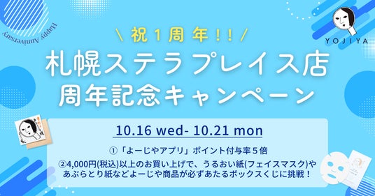 よーじやグループ(京都府京都市下京区、代表取締役・國枝昂)は、昨年8月に札幌ステラプレイスに常設店をオープンして1周年を迎えました。これを記念し2024年10月16日(水)~10月21日(月)の間、札幌ステラプレイス店限定で「よーじやアプリ」のポイント付与率5倍キャンペーンを実施いたします。さらに、4,000円(税込)以上ご購入いただいた方に、よーじやの商品が必ずもらえるボックスくじに挑戦していただけます。今年8月より実施してきた周年記念キャンペーンも今回がラスト。定番のあぶらとり紙などはもちろん、期間限定商品や新商品など多くのアイテムを取り揃えた「よーじや 札幌ステラプレイス店」へ、この機会にぜひお越しくださいませ。