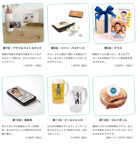 すべての商品は1個から注文可能で、パソコンやスマホから簡単にデザインできます。「父の日に何を贈ろう?」と迷っている方に向けて、“人気グッズ12選”として、定番から少し変わったアイテムまで幅広く紹介しています。