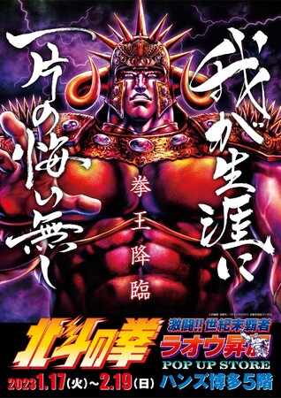 マンガ、アニメ、特撮などを始めとするサブカルチャーをテーマとした企画展を開催・運営している株式会社クレイジーバンプは2023年1月17日(火)よりハンズ博多にて開催する【北斗の拳~激闘!!世紀末覇者ラオウ昇展~ POP UP STORE】の情報を公開致します。