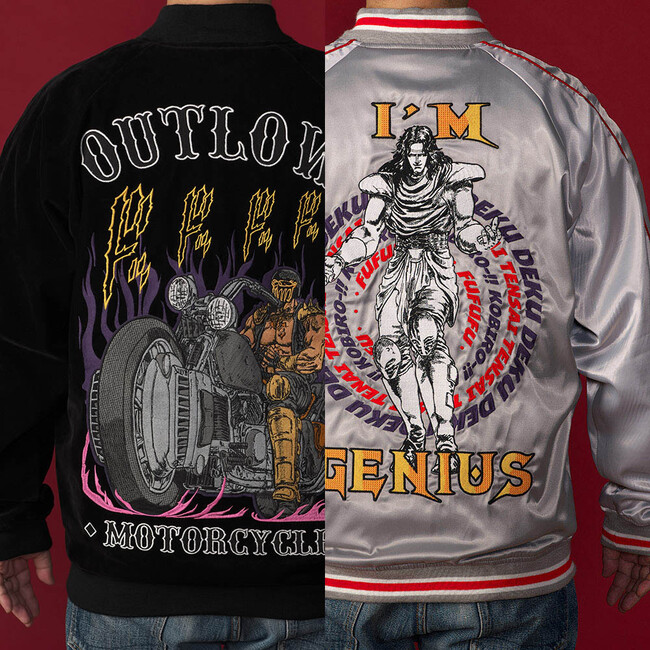 ジャギ&アミバ リバーシブルスカジャン/27,500円(税込) サイズ:M~XXL 作中屈指の悪党として人気を誇る「ジャギ」と「アミバ」!この二人を総刺繍で仕上げた、偽物ではない本物クオリティなリバーシブルスカジャンが登場!黒ベースのジャギSIDE、シルバーベースのアミバSIDE!あなたが着たいのは、天下の外道か天才か?!