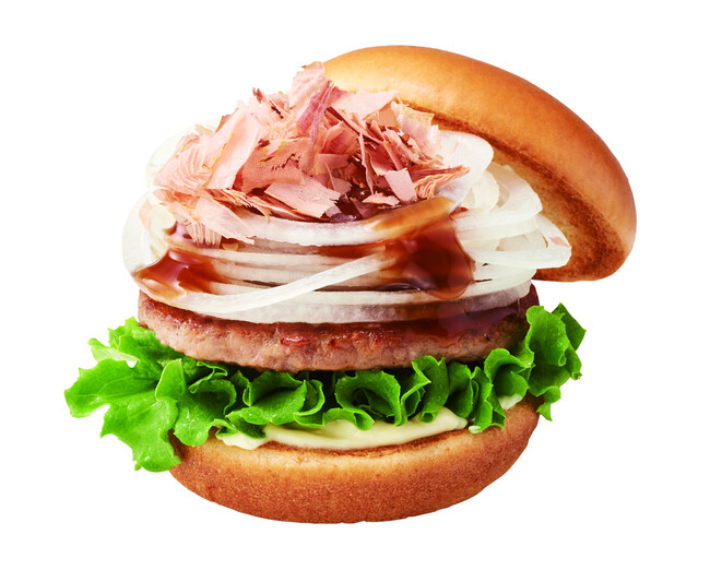 淡路島産の『新たまねぎ』を生でたっぷりと使用したハンバーガーです。グリーンリーフとジューシーなパティ(肉)、オリジナルのたまねぎバーガー用ソース、輪切りにスライスした淡路島産新たまねぎをたっぷりと乗せ、その上からさらにたまねぎバーガー用ソースをかけ、最後にかれ節※を原料として使用したかつお節をトッピングしました。