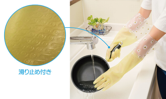 スムーズに着脱でき、ひじまですっぽり覆うロングタイプなので、水仕事中の袖口の水ぬれを防ぎます。
