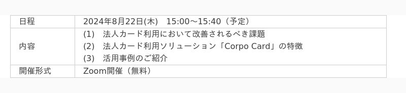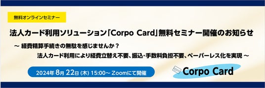 株式会社ニーズウェル(本社:東京都千代田区、代表取締役社長 船津浩三)は、2024年8月22日(木)15時より、無料オンラインセミナー「法人カード利用ソリューション「Corpo Card」無料セミナー ~経費精算手続きの無駄を感じませんか?法人カード利用により経費立替え不要、振込・手数料負担不要、ペーパーレス化を実現~」を開催します。