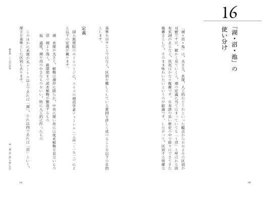 “「湖」「沼」「池」、どんな意味の違いがある? 日本語の意味や使い方、そして発音や表記に関する30のテーマを設け、著者の考え方や提案が示される。そこに、あなたも参加する。そんな楽しさを秘めた絶好の著作。”