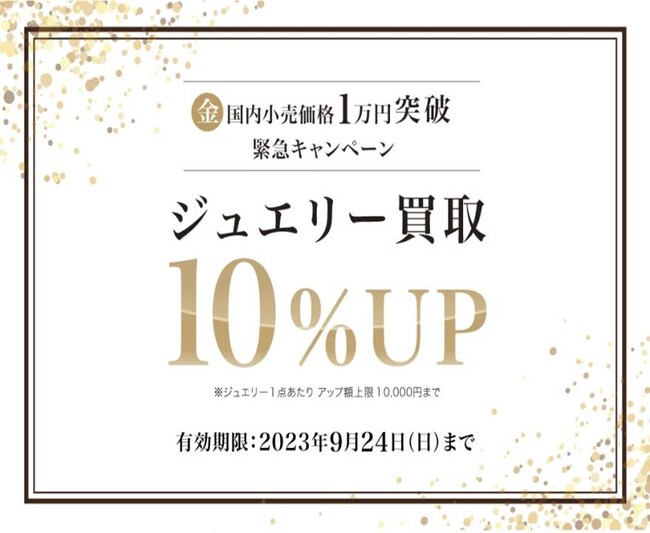 日本最大級のリユースデパート「KOMEHYO」を展開する株式会社コメ兵(以下、KOMEHYO)は、国内の金小売価格が1万円台を突破したことを機に、2023年8月30日(水)~9月24日(日)の期間限定で、宝石・貴金属の買取キャンペーンを開催します。