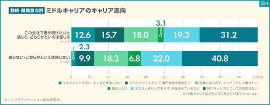 続いて、ミドルキャリアのキャリア志向が、現在の会社への[勤続][離職]意向と関係があるかを見ていきます。