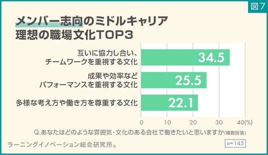 役職にはつかず、メンバーとして働きたいミドルキャリアは、「互いに協力し合い、チームワークを重視する文化」と回答した割合が34.5%と最も高くなりました。(図7)