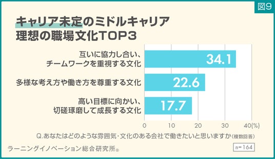 キャリアについてまだはっきりしておらず、今後決めていきたいミドルキャリアは、「互いに協力し合い、チームワークを重視する文化」(34.1%)が最も理想である結果となりました。次に、「多様な考え方や働き方を尊重する文化」が22.6%と、他の群よりも高い割合となりました。(図9)