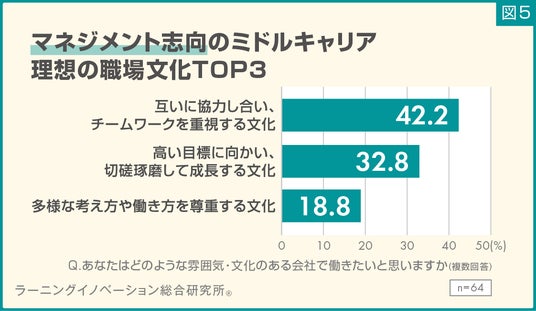 マネジメント志向のミドルキャリアは、「互いに協力し合い、チームワークを重視する文化」と回答した割合が42.2%となり、他の群よりも高い割合となりました。(図5)