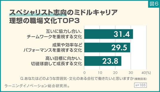スペシャリスト志向のミドルキャリアは、「互いに協力し合い、チームワークを重視する文化」と回答した割合が31.4%と最も高くなりました。次に、「成果や効率などパフォーマンスを重視する文化」が29.5%と続き、他の群の中で最も高い割合となりました。(図6)