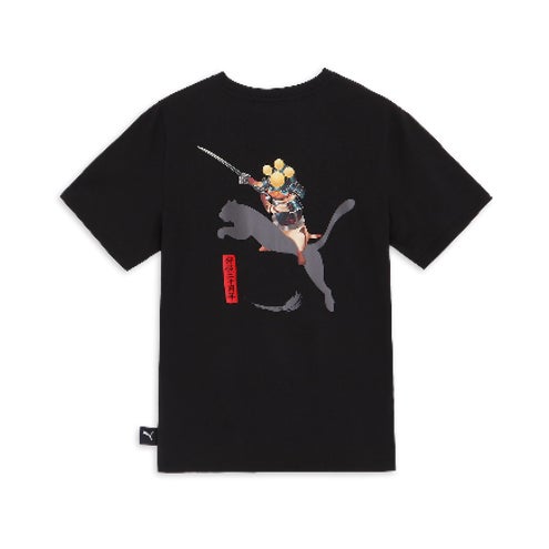 今回は第2弾コレクションとして、アパレルにはシリーズに登場する人気キャラクター“アイルー”をモチーフにした特別デザインがされており、日本の武者をモチーフにしたアイルーとPUMA Catがバックプリントに大胆に施されたデザインが特徴です。フロント右胸にはプーマロゴ、左胸にはひらがなで描かれた“もんはん”が配置され、日本のイメージを巧みに取り入れたスペシャルなアイテムに仕上がっています。さらに、第1弾で完売したアパレルアイテムの再販も実現し、ファンにとって見逃せない内容となっています。