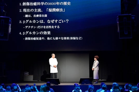 その後、弊社リサーチ&イノベーションセンター 基礎研究所シニアエキスパートの鈴木格と菅野恵美氏により、「肌の美しさと創傷治癒プロセスの関係」、「βグルカンの純度の重要性」などQ&Aセッションが行われ、肌の回復力が肌の美しさに影響を与えることが紹介されました。