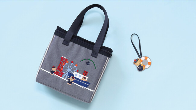 保冷バッグは、神戸らしいマリンのアートで、平デニムとボーダー生地の切替デザイン。500mlのペットボトルを計6本ほど収納できるサイズ感で、便利な保冷剤ポケット付き。