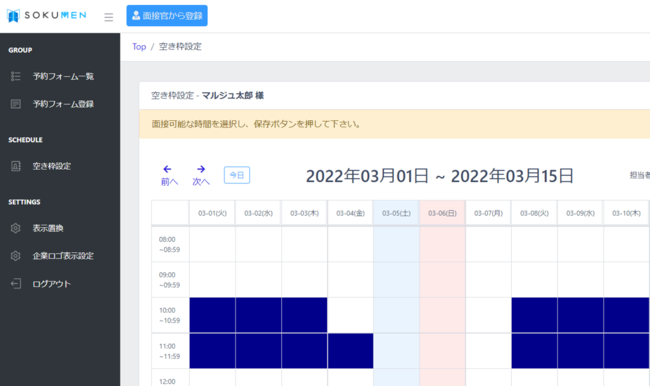 Web面接ツールSOKUMENでは面接の日程を応募者が予約可能なオンライン予約受付機能(日程調整機能)を搭載しています。