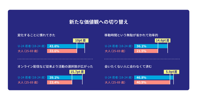 U-24世代の若者と、大人世代(25-69歳)のそれぞれに対し、アフターコロナにおける新たな価値観への切り替えについて質問したところ、「変化することに慣れてきた」と回答した割合は若者が43.6%、大人が33.6%と10ポイントの差がついたほか、「移動という無駄が省かれて効率的」若者36.1%、大人21.5%、「オンライン配信など従来よりも活動の選択肢が広がった」若者39.1%、大人23.4%、「会いたくない人に会わなくて済む」若者46.8%、大人40.9%と、いずれも若者の共感度がより高い結果になりました。これらの結果から、不便が多いコロナ禍の状況で発生した変化を前向きに捉え、新たな価値観にシフトしはじめている若者が、大人と比較して多いことが窺えます。