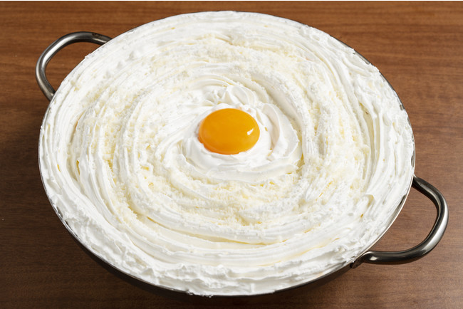 スタッフが出来立てのラッポギの上に、お客様の目の前でクリームを絞って仕上げます。見た目も味もインパクトがある一品です。