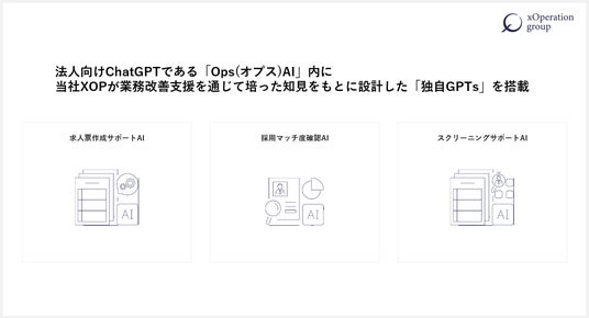 先端技術と業務(Ops)の融合に強みを持ち、生成AIを活用した業務改善支援を行う株式会社クロス・オペレーショングループ(東京都千代田区、代表取締役:田中亮大、以下XOP)は、自社で開発する法人向けChatGPT「OpsAI」(オプスAI)内に、独自プロンプトを搭載させたGPTsとして、【求人票作成サポートAI】【採用マッチ度確認AI】【スクリーニングサポートAI】の提供を開始したことをお知らせいたします。