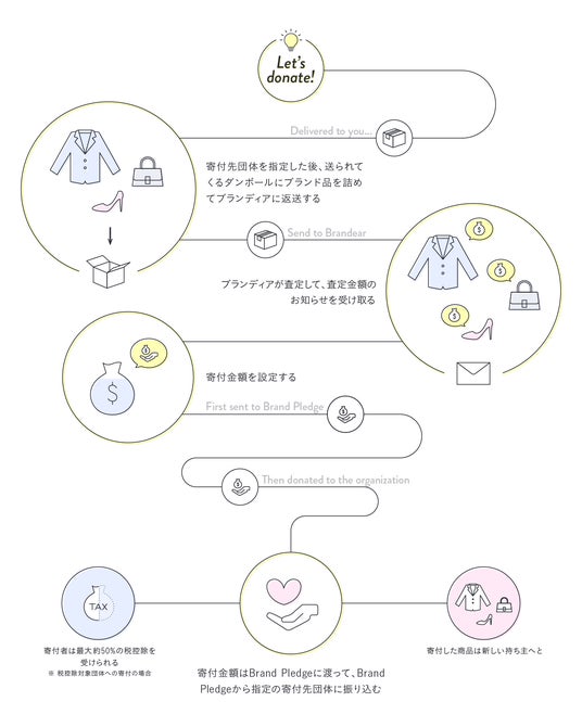 株式会社STYZ社が運営するオンライン寄付プラットフォーム「Syncable」と株式会社デファクトスタンダードが運営するブランド品買取プラットフォーム「ブランディア」が共同で提供する 「Brand Pledge(ブランドプレッジ)」 は、衣替えで生まれる不要なブランド衣類などを通年で受け入れ、査定額をNPOに寄付できます。また「デファクトスタンダード」では2030年までに廃棄ゼロを掲げ、査定がつかないノーブランド品もリメイク・教育用途へ循環させる取り組みを行って参りました。