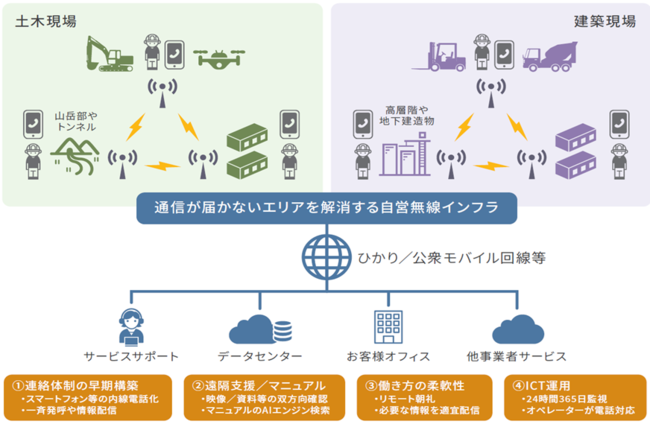 お客様のオフィスやデータセンタ、他社が提供するクラウド等、さまざまなサービスと建設現場を接続し、従来難しかったエリアでのICT化を加速させ建設現場の課題解決を支援します。