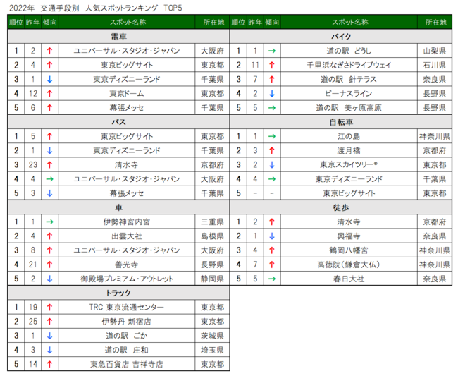 ・『交通手段別 人気スポットランキング』TOP30 (電車、バス、車、トラック、バイク、自転車、徒歩)
