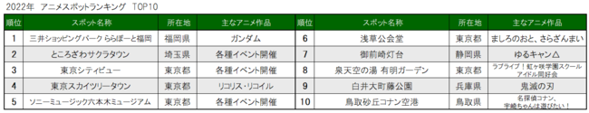 今年のアニメ関連ランキングは、アニメの舞台となったスポットに加え、アニメ関連のコラボイベントが開催されたスポットを独自に調査し、対象範囲を拡大して集計しました。全国各地でイベントが少しずつ再開されていることからイベント開催スポットが上位にランクインしました。また、昨年までは公園や屋外の観光スポットが多くランクインしていましたが、今年はショッピングモールや商業ビルなど街中のスポットが並ぶのも特徴です。