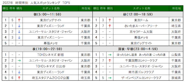 どの時間帯も、半数が入れ替わったのが今年の最大の特徴です。朝はテーマパークに加えてイベントホール/公会堂が新たに多くランクインしました。昼はイベントホール/公会堂とスタジアム/球場、夜は映画館、深夜・早朝はゴルフ場と、時間帯による特徴が顕著に出る結果となりました。夜のランキングでは、一昨年まで定番だった映画館が昨年は1件となっていましたが、今年は5件とまた増加しています。